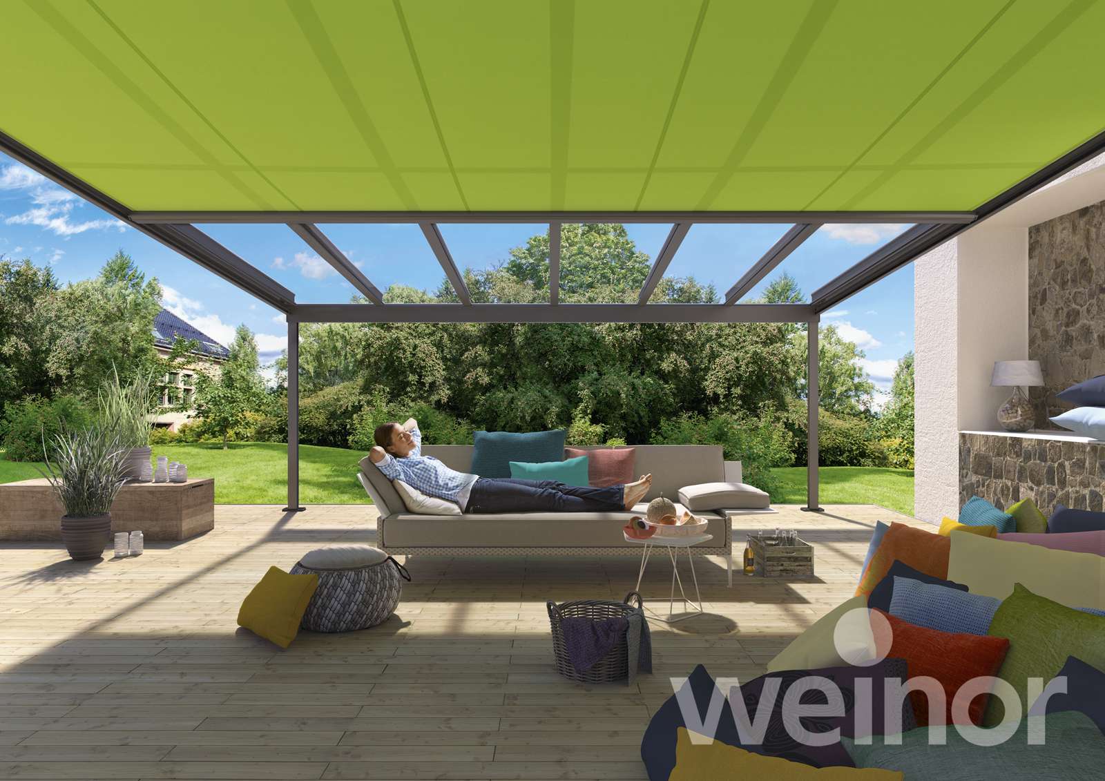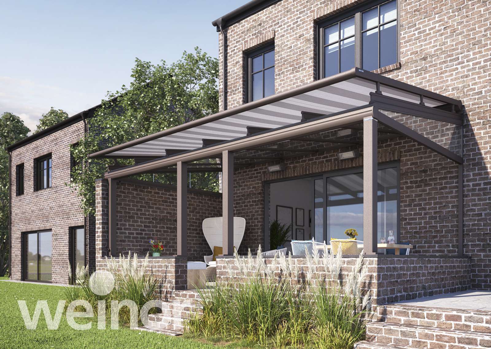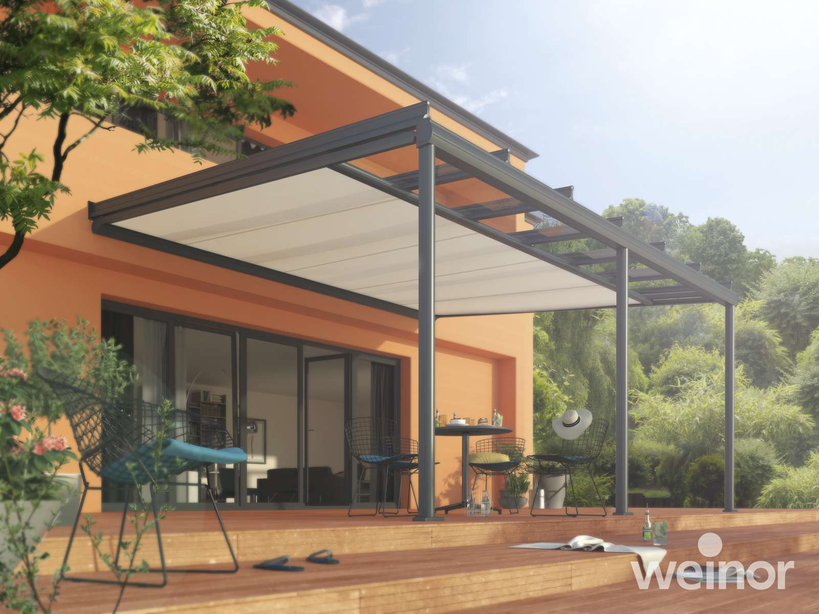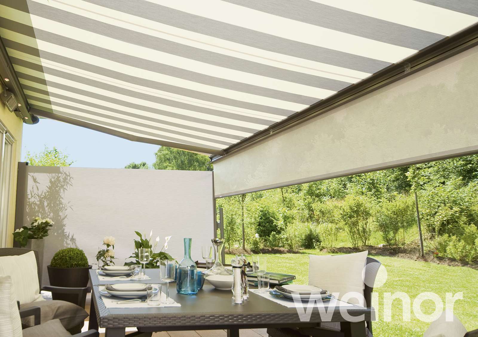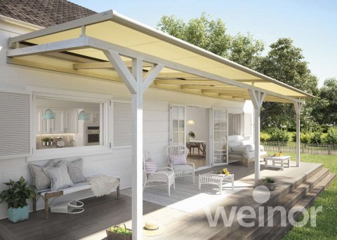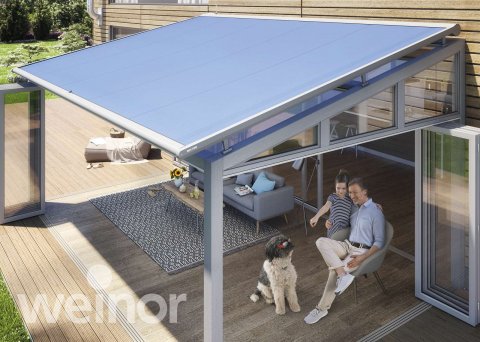 Untergesetzte Wintergartenmarkisen – diese werden unter das Dach montiert und reduzieren die Hitzeentwicklung unter dem Glas. In den kühleren Jahreszeiten werden die wärmenden Sonnenstrahlen zum Aufwärmen des Terrassenplatzes genutzt.