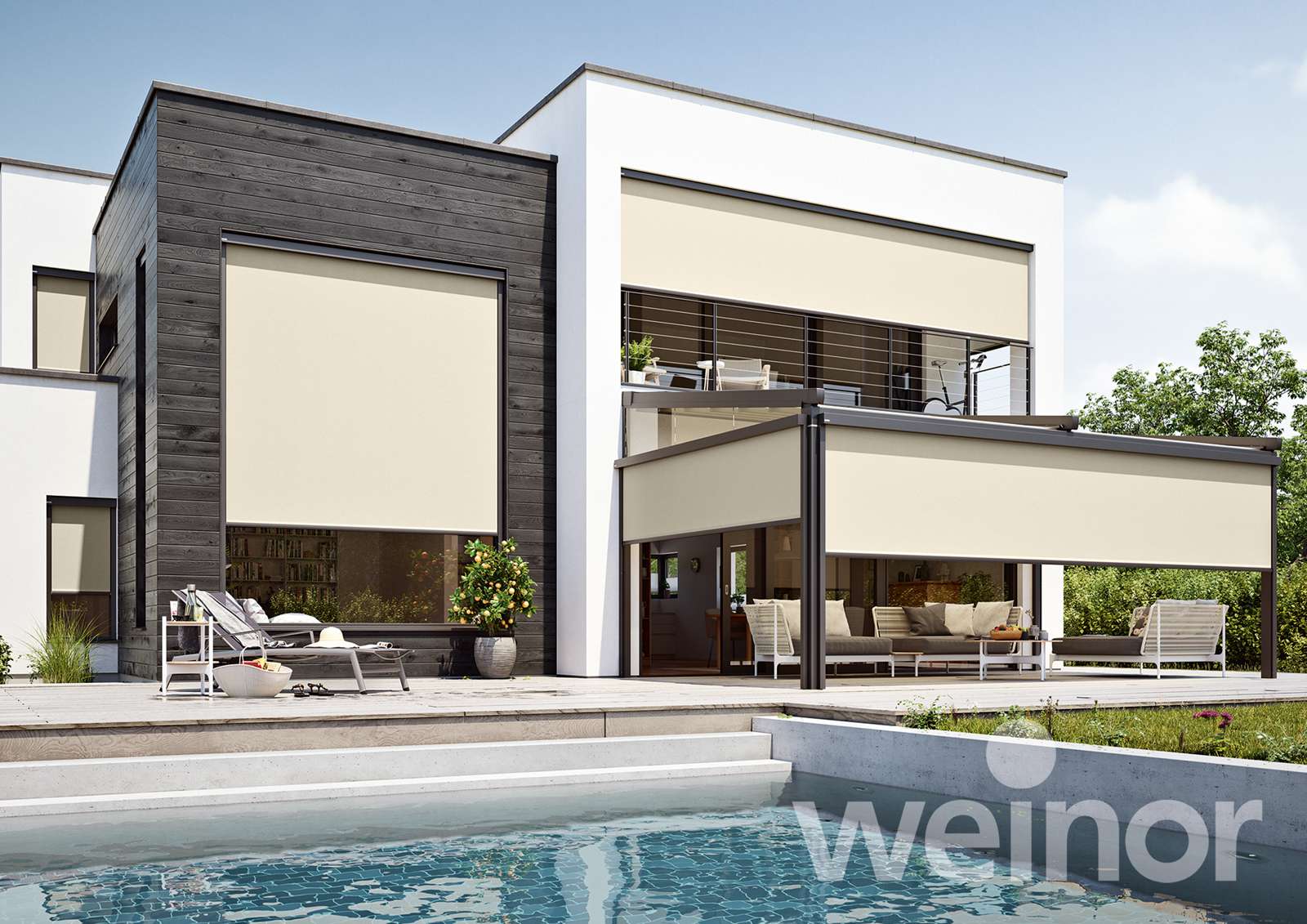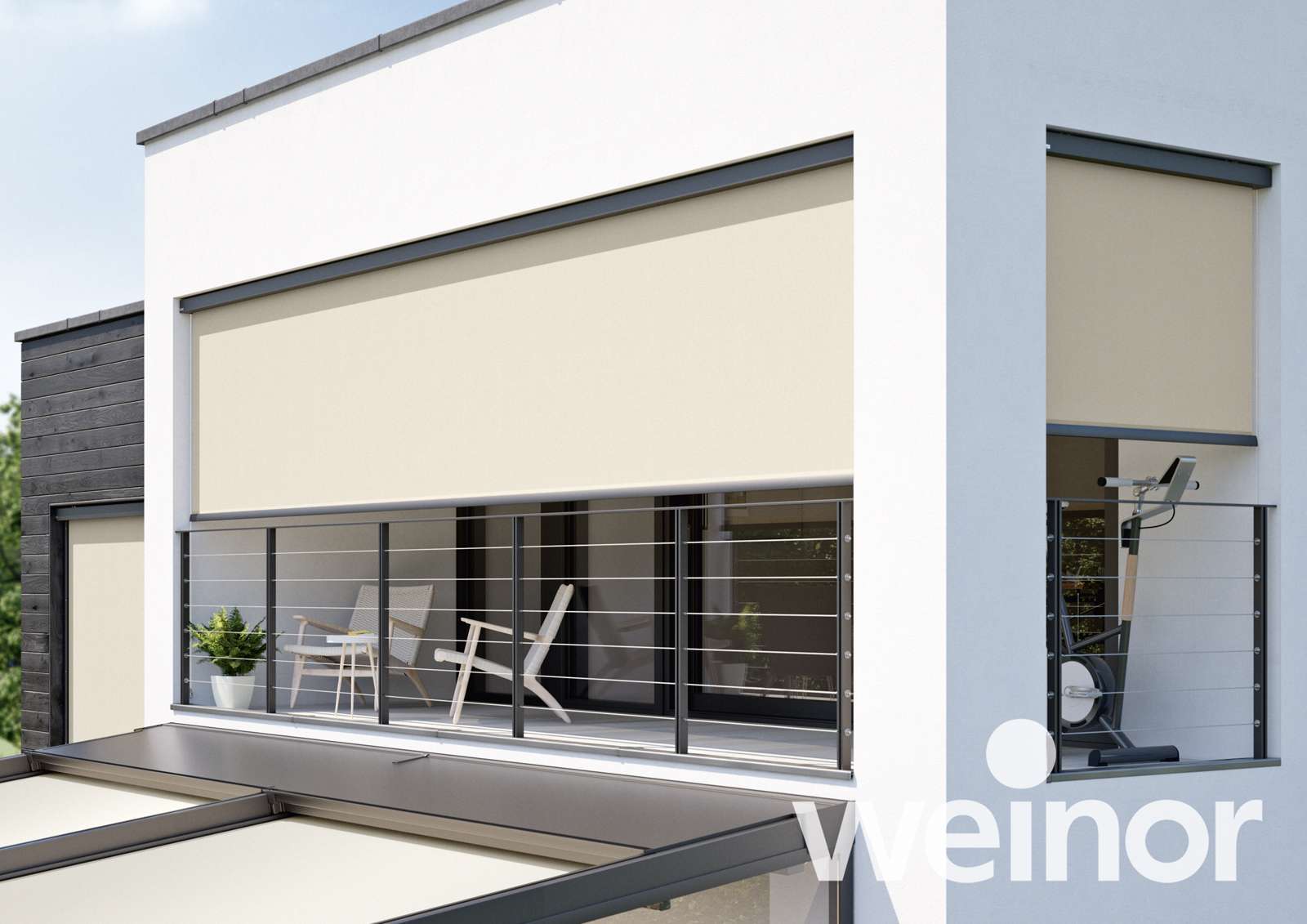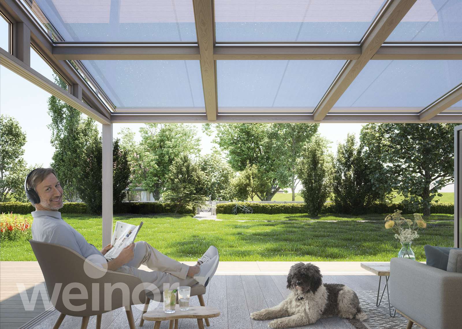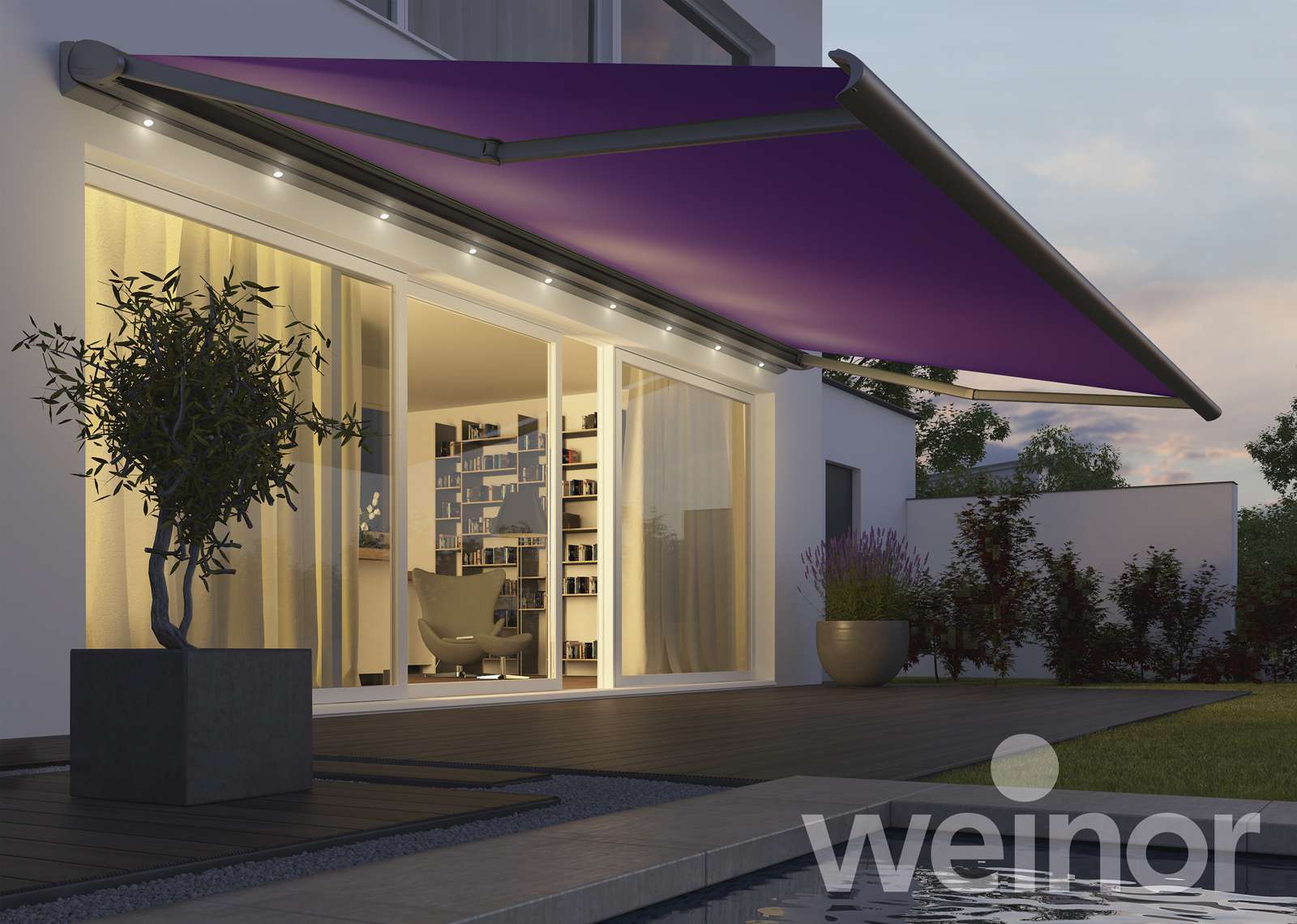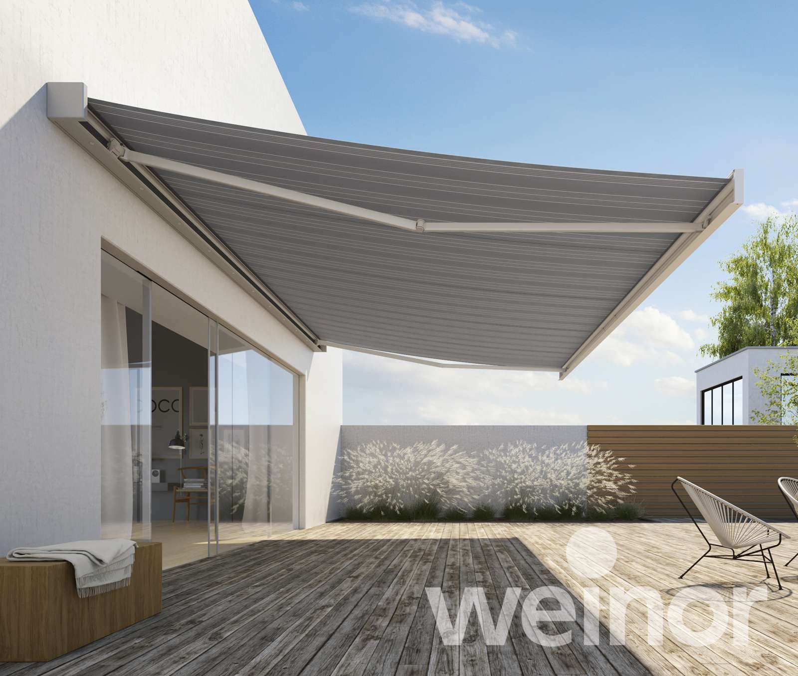 Untergesetzte Wintergartenmarkisen – diese werden unter das Dach montiert und reduzieren die Hitzeentwicklung unter dem Glas. In den kühleren Jahreszeiten werden die wärmenden Sonnenstrahlen zum Aufwärmen des Terrassenplatzes genutzt.